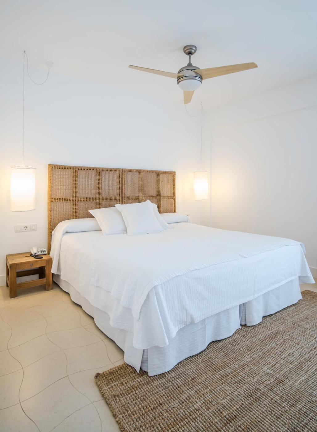 All rooms at Hotel Es Marès feature an elegant all-white design and local beach-inspired decorative details. Each has a ceiling fan and a modern bathroom.